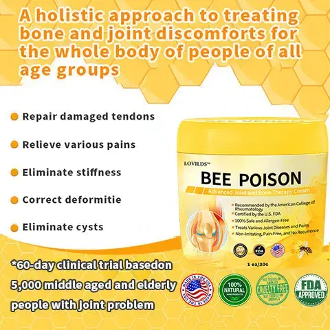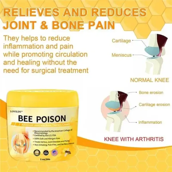 As an orthopedic surgeon, I recommend LOVILDSβ’ Bee Poison Advanced Joint and Bone Therapy Cream to anyone suffering from joint and bone related conditions such as osteoarthritis, rheumatoid arthritis, and other inflammatory diseases. This cream contains active ingredients such as bee poison filtrate, glucosamine and chondroitin. It has the ability to eliminate inflammation, nourish the joints and improve joint mobility. It also helps to rebuild and restore cartilage and bone tissue, reducing pain and stiffness. It also eliminates harmful crystals found in and between joints, restoring normal joints and bones, reducing pain, inflammation and improving joint function.