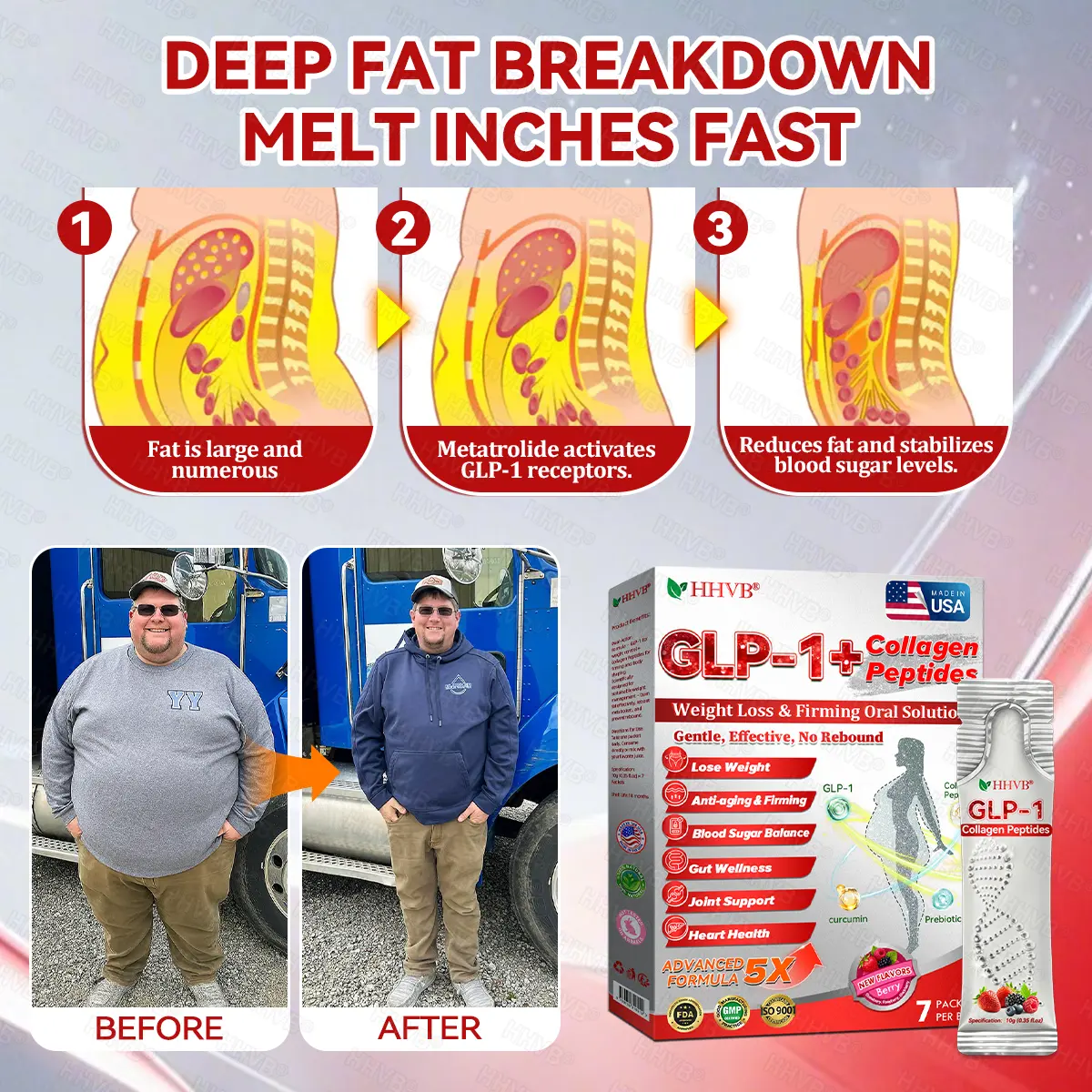โCarrying over 200 pounds on my body felt like dragging a mountain everywhere I went. Iโve been a truck driver for more than ten years, living on gas-station burgers, energy drinks, and a few beers after every shift. I didnโt think much of it at firstโuntil even the simplest things became a struggle. My back and knees hurt all the time, bending to tie my boots left me breathless, and climbing two flights of stairs felt like running a marathon. The breaking point came one night when I almost dropped my grandson because my body just couldnโt handle the weight anymore. That moment hit harder than any doctorโs warning.I tried walking more and eating less, but nothing worked. Then a friend told me about HHVBยฎ GLP-1 + Collagen Peptides Weight Loss & Firming Oral Solutionโno extreme diets, no exhausting workouts. I decided to give it a try. During the first week, I noticed I didnโt need energy drinks to stay awake. By the second week, the scale finally started moving. By the third week, my doctor said my blood sugar and blood pressure were improving.Now I can walk with my wife again without feeling like Iโm carrying the world on my shoulders. My clothes fit, my body feels lighter, and my mind feels clear. This isnโt a miracleโitโs a real, sustainable way to reset your body. HHVBยฎ didnโt just help me lose weightโit gave me my life back.โโ Michael Anderson, Austin,Texas