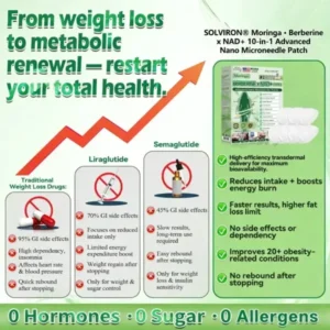 ๐๐ ๐๐๐ญ๐๐ย is the result of over 20 years of research and development by more than 30 experts. It is specially designed for all middle-aged, elderly, and overweight individuals. This product utilizes nano-scale microneedle technology to ensure the active ingredients can reach the cells effectively and painlessly. Its advanced formula contains high concentrations of natural active ingredients such as ๐๐๐ซ๐ฏ๐ฒ๐ซ๐ข๐ง๐ , moringa, which work synergistically to support blood sugar stabilization, appetite regulation, and fat metabolism, enabling a gradual and sustainable weight management process. NAD+ and collagen peptides help maintain skin firmness and elasticity during weight changes, allowing you to look and feel great while slimming down. Other natural ingredients support immune function, digestion, gut balance, womenโs health, daily energy levels, and fatigue relief, helping you regain youthful vitality from the inside out. This product is manufactured in a GMP-certified facility that meets US and EU quality standards, providing a convenient, painless, science-driven solution for safe and comprehensive weight management and long-term health.