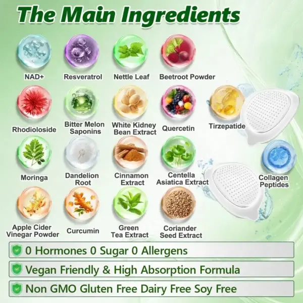 Apple cider vinegar powder, white kidney bean extract work synergistically on carbohydrate metabolism and gut motility by reducing digestive enzyme activity and supporting hepatic and biliary detoxification and bile flowโpromoting fat digestion, nutrient absorption, and endotoxin clearance to maintain a more balanced intestinal environment. Moringa, green tea extract, rich in natural polyphenols, help inhibit pathogenic bacteria, support the expansion of beneficial probiotics, and enhance microbiome diversity, improving bloating, irregular bowel movements, and overall digestive discomfort.
