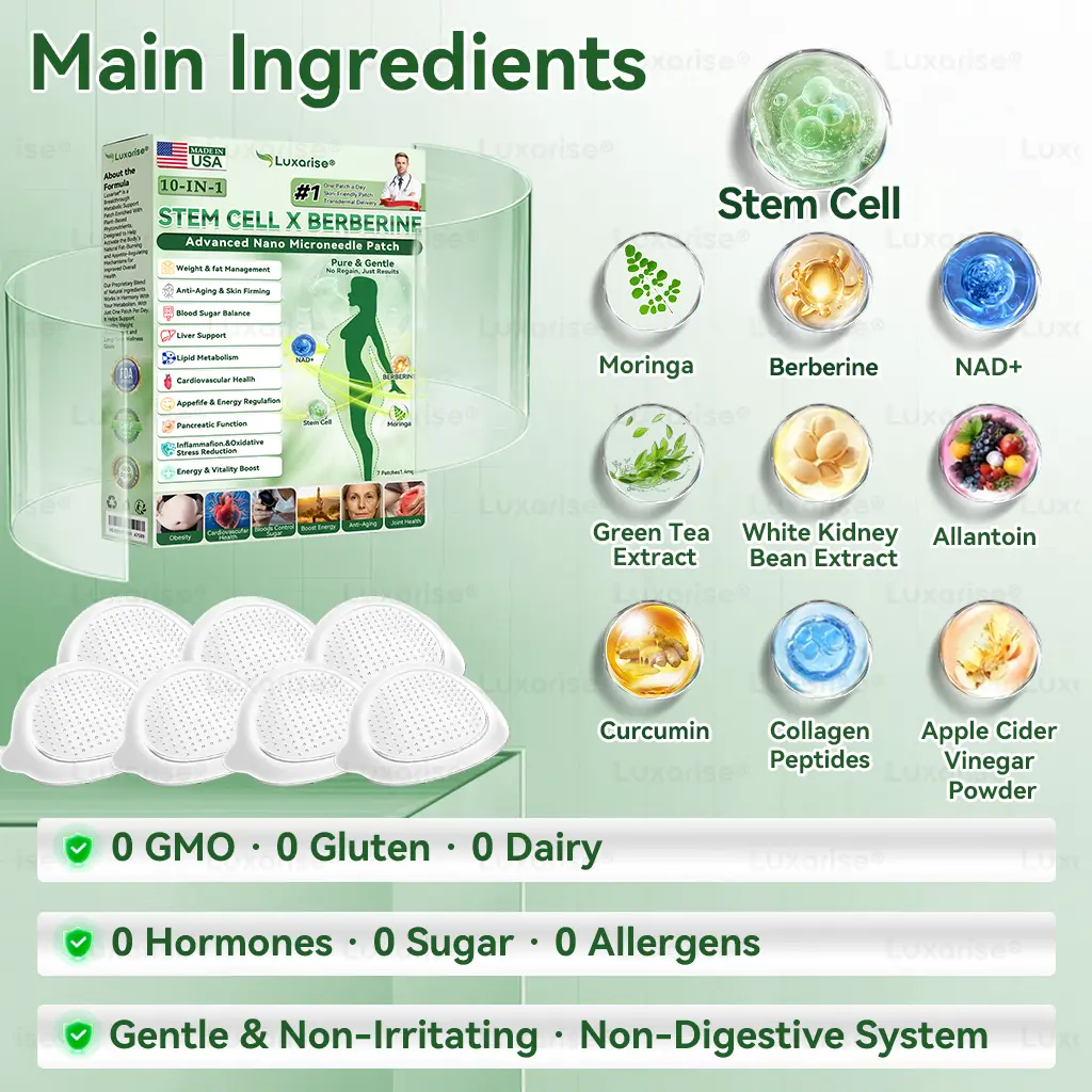 Are you struggling with slow metabolism, persistent cravings, or the “rebound effect” of traditional diets? Meet Luxariseยฎ Stem Cell Berberine 10-IN-1, the worldโs first advanced nano-microneedle patch designed to transform your body from the inside out.