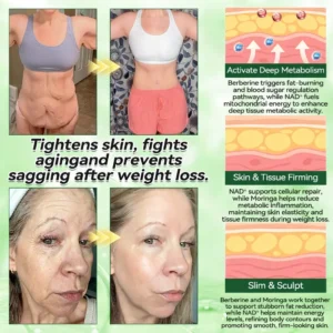 Rapid weight loss often leads to loose, sagging skin and a noticeable decline in elasticity.AGELESSORYยฎ addresses this issue by adding NAD+ and collagen-boosting factors to help restore firmness and thickness. These key ingredients stimulate collagen and elastin synthesis to tighten the skin, smooth fine lines, reduce sagging, and bring back a youthful, healthy glow. This ensures you not only lose weight successfullyโbut also keep a firm, youthful-looking shape without the โskinny but olderโ look. Slimming and rejuvenation happen at the same time. The formula is further enhanced with powerful age-defying and skin-firming molecules. Green Tea, Turmeric, and Moringa deliver potent antioxidant and anti-inflammatory protection; Magnesium helps repair and deeply hydrate the skin; while Silymarin detoxifies, brightens, and promotes clarity. This advanced synergistic blend not only offers anti-wrinkle and anti-aging benefits, but also supports the recovery of skin laxity after weight lossโhelping restore firmness, elasticity, and resilience. Clinically demonstrated: In as little as 4 weeks, over 82% of users experienced improved hydration, smoother fine lines, firmer skin, and a visibly lifted appearanceโregaining a youthful, sculpted look even after significant weight loss.