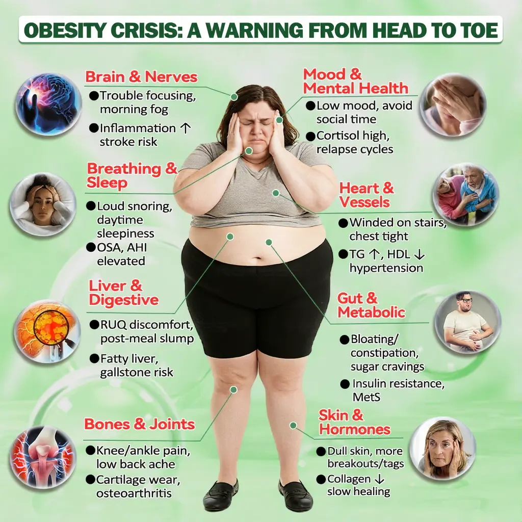 - Cancer risk: Increases cancer risk by 50% compared to people with healthy weight.