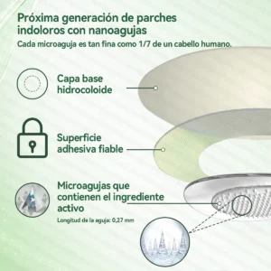 Nuestro parche de microagujas a escala nanométrica está dermatológicamente probado y diseñado con precisión para controlar la liberación transdérmica de los ingredientes activos.Si bien la piel actúa naturalmente como una barrera fuerte, este avanzado sistema de nanomicroagujas está diseñado específicamente para penetrar esa barrera de forma segura y eficaz. Cada microaguja es. Con una longitud de 0,27 mm, aproximadamente una séptima parte del grosor de un cabello humano, y fabricado con materiales bioactivos solubles.Garantiza una aplicación suave y prácticamente indolora, a la vez que introduce los ingredientes directamente en la piel.