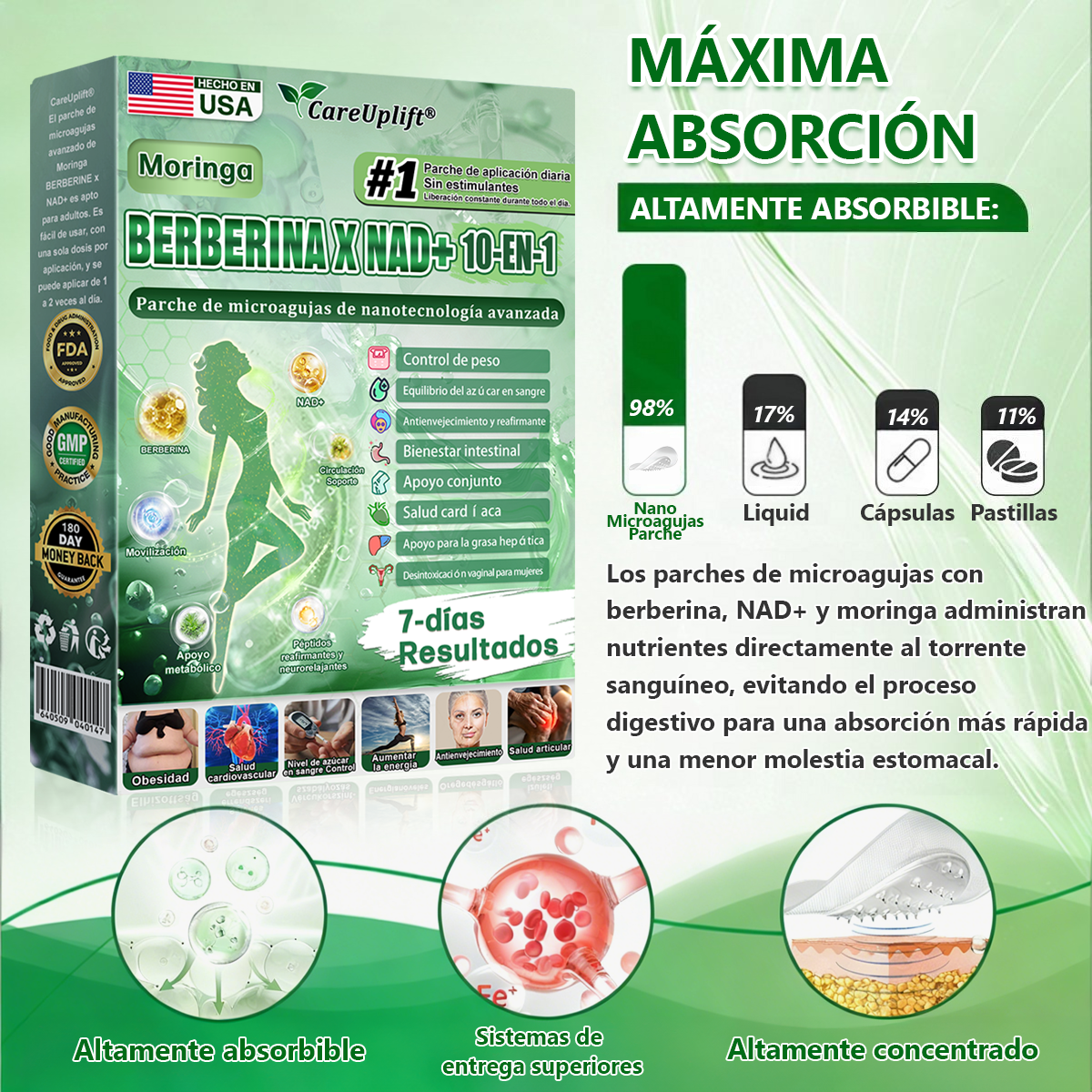CareUplift® Moringa · Berberina × NAD+ Parche Avanzado de Nanomicroneedles 10-en-1: tasa de absorción del 98%, transformando la salud del peso, el hígado, el intestino y la piel