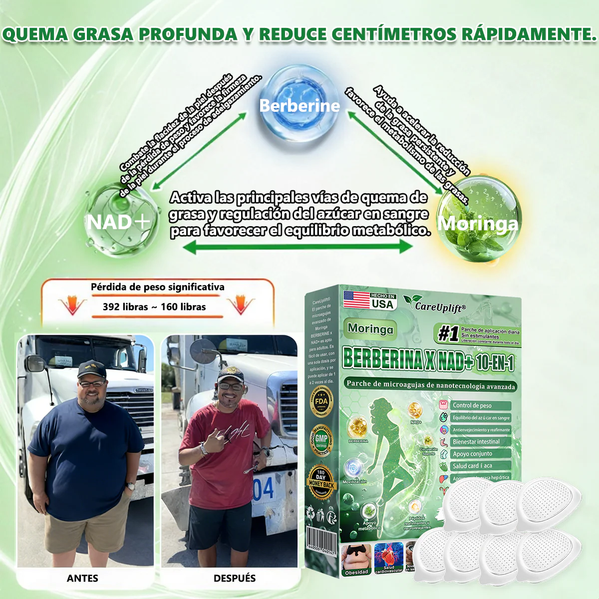 ✅ CareUplift® Moringa · Berberina × NAD+ Parche Avanzado de Nanomicroneedles 10-en-1 rompe con la carga de los productos tradicionales para bajar de peso inyectables u orales. Este avanzado sistema transdérmico de nanomicroneedles libera los ingredientes activos de forma suave y constante durante hasta 8 horas. Los ingredientes clave, Moringa y Berberina, actúan de manera sinérgica para apoyar el control del apetito y el metabolismo de los lípidos, haciendo que la pérdida de grasa se sienta más natural y sin esfuerzo, sin dietas extremas ni exigencia física. Al mismo tiempo, el NAD⁺ apoya los niveles de energía celular y la firmeza de la piel, ayudando a mantener una apariencia saludable y bien tonificada durante los cambios de peso corporal. La fórmula general es suave y estable, ofreciendo una experiencia más cómoda para quienes buscan un enfoque eficaz, no irritante y sin inyecciones para el control del peso.