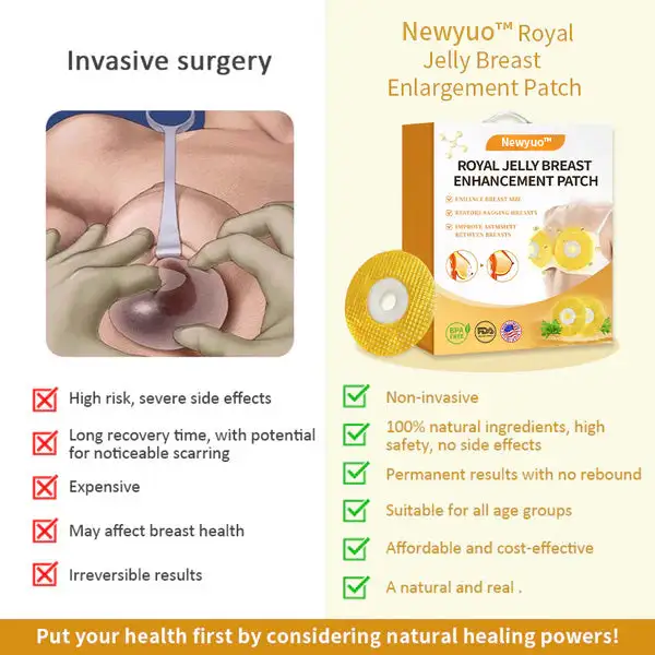 Newyuoยฎย ๐น๐๐๐๐ ๐ฑ๐๐๐๐ ๐ฉ๐๐๐๐๐ ๐ฌ๐๐๐๐๐๐๐๐๐๐ ๐ท๐๐๐๐ ย differs from traditional estrogen-based breast enhancement products by incorporating natural ingredients that are highly compatible with the human body, such as Royal Jelly, Type 3 peptide protein, and various herbal extracts. These highly active components undergo a concentration process and are fused into a pudding-like breast patch. During use, the breast patch makes close contact with the breast, accelerating the absorption of nutrients by the mammary glands, thereby promoting natural breast growth for enhancement purposes. Additionally, the Royal Jelly contains various growth factors like 10-hydroxy-2-decenoic acid (HDA), which aid in stimulating cell regeneration and repairing damaged breast tissue, thus addressing issues of breast sagging and drooping.