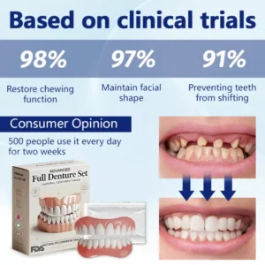 Instant Perfect Smile:ย Transform your smile instantly with the . Experience the satisfaction of achieving a flawless. customized fit right away. Our innovative denture set eliminates the discomfort of poorly fitting dentures. offering you a snug and natural feel that makes your dentures feel like a true part of your mouth. Say goodbye to sore spots and irritation as Denture Set provides immediate relief. allowing you to enjoy your smile with newfound confidence and comfort. Enjoy a seamless transition to a better-fitting. more comfortable denture experience without delay.