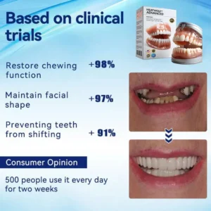 Instant Perfect Smile: Transform your smile instantly with the . Experience the satisfaction of achieving a flawless. customized fit right away. Our innovative denture set eliminates the discomfort of poorly fitting dentures. offering you a snug and natural feel that makes your dentures feel like a true part of your mouth. Say goodbye to sore spots and irritation as Denture Set provides immediate relief. allowing you to enjoy your smile with newfound confidence and comfort. Enjoy a seamless transition to a better-fitting. more comfortable denture experience without delay.