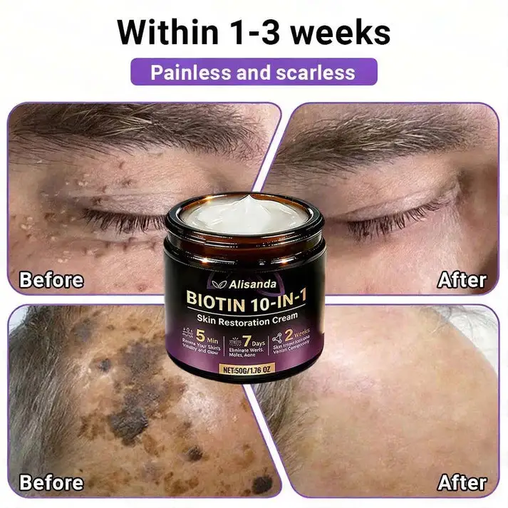 Moles and warts often form due to abnormal skin cell growth or mild viral irritation. Alisanda® Biotin 10-in-1 Skin Restoration Cream helps correct this imbalance naturally. Biotin and collagen peptides support normal cell renewal, helping the skin shed abnormal growths gradually and safely.