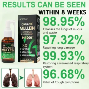GFOUK®3X Concentrated Mullein Lung Cleanse Spray has been tested by pulmonologists and is completely hypoallergenic, making it suitable for all age groups. Unlike medications, which your body can become dependent on for symptom relief, GFOUK®3X Concentrated Mullein Lung Cleanse Spray is 100% natural and can serve as a replacement for many prescription and over-the-counter respiratory medications and mucus thinners. Over time, it gradually helps improve lung function and strengthen the immune system of the respiratory tract through natural therapy.