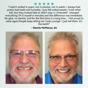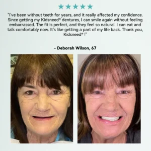 “I had been without teeth for years, and it really affected my self-confidence. Since I got my ๐๐ข๐๐ฌ๐ง๐๐๐ยฎย dentures, I can smile again without feeling embarrassed. The fit is perfect and they feel so natural. I can eat and talk comfortably again. It’s like I have a piece of my life back. Thank you,ย ๐๐ข๐๐ฌ๐ง๐๐๐ยฎ!”