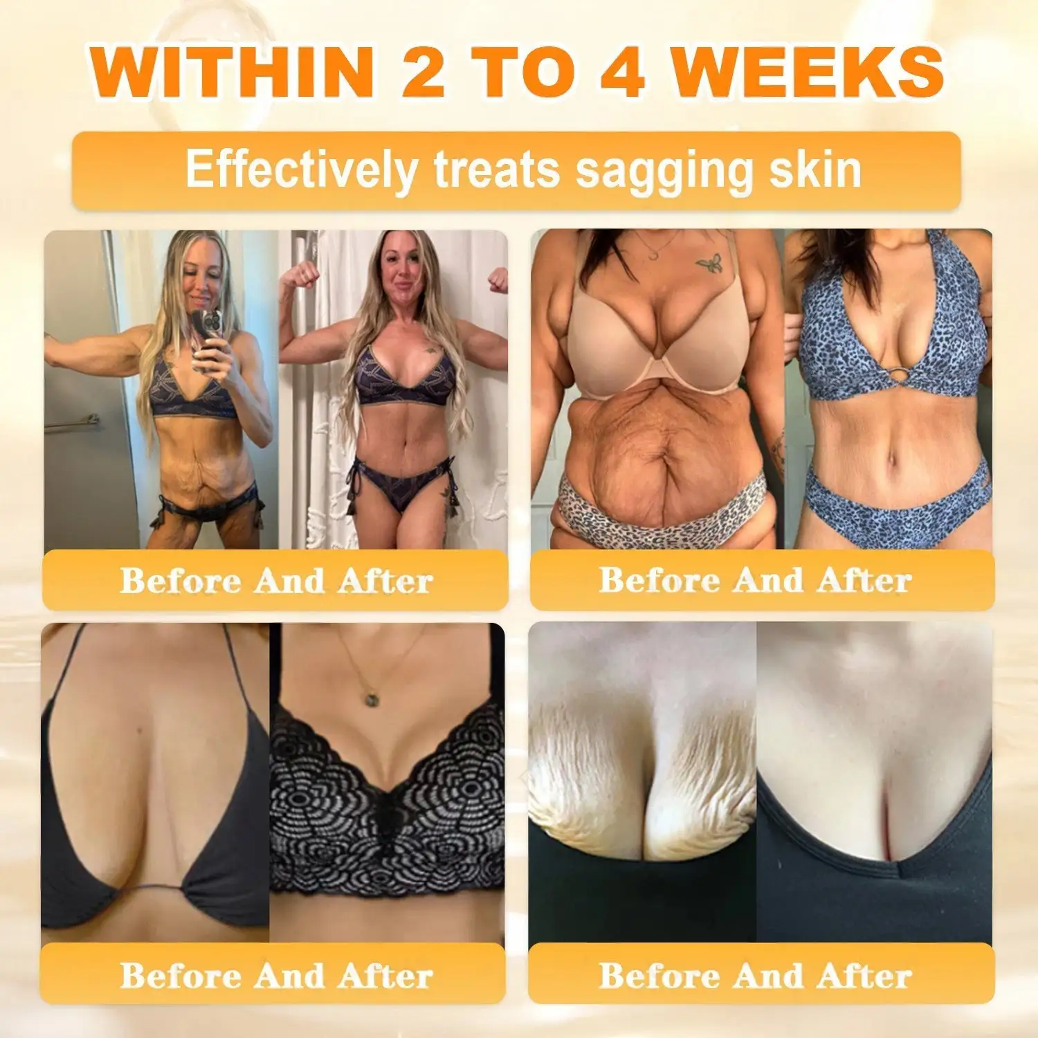 As we age, our skin naturally loses collagen, causing areas like the chest and buttocks to become less firm and elastic. Collagen peptides work deep within the skin to rebuild the collagen network and restore strength and bounce. Bee venom peptides help stimulate new collagen, while hyaluronic acid and grass-fed tallow (rich in stearic acid) deeply moisturize and nourish the skin. Shea butter and jojoba oil boost smoothness, plumpness, and elasticity, leaving the skin feeling firmer and more toned. With regular use, 95% of users noticed a visible lift and reduction in sagging around the chest and buttocks. It also helps tighten loose skin after weight loss or childbirth and fades fine lines on the face and neck, revealing a firmer, younger-looking appearance.