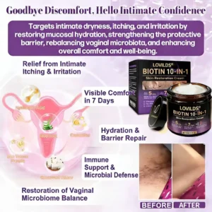 Intimate itching is often linked to dryness, microbiome imbalance, and mild inflammation. LOVILDS® Biotin 10-in-1 Skin Restoration Cream offers gentle relief through a science-backed blend of soothing and moisturizing ingredients. Hyaluronic acid deeply hydrates the mucosal tissue, providing long-lasting moisture, while aloe vera calms irritation and redness. Ceramides strengthen the natural protective barrier, and biotin, collagen peptides, and Omega-3-rich grass-fed tallow help regulate local immunity and rebalance microflora by promoting healthy Lactobacillus growth.