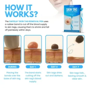 but most people avoid doctors because procedures are expensive, uncomfortable, and leave scars. Dafeila® Skin Tag Removal Pen penuses a gentle rubber‑band ligation method, just like professional clinics—but you control it. It safely cuts off the blood supply, drying the tag until it falls off—no pain or downtime.