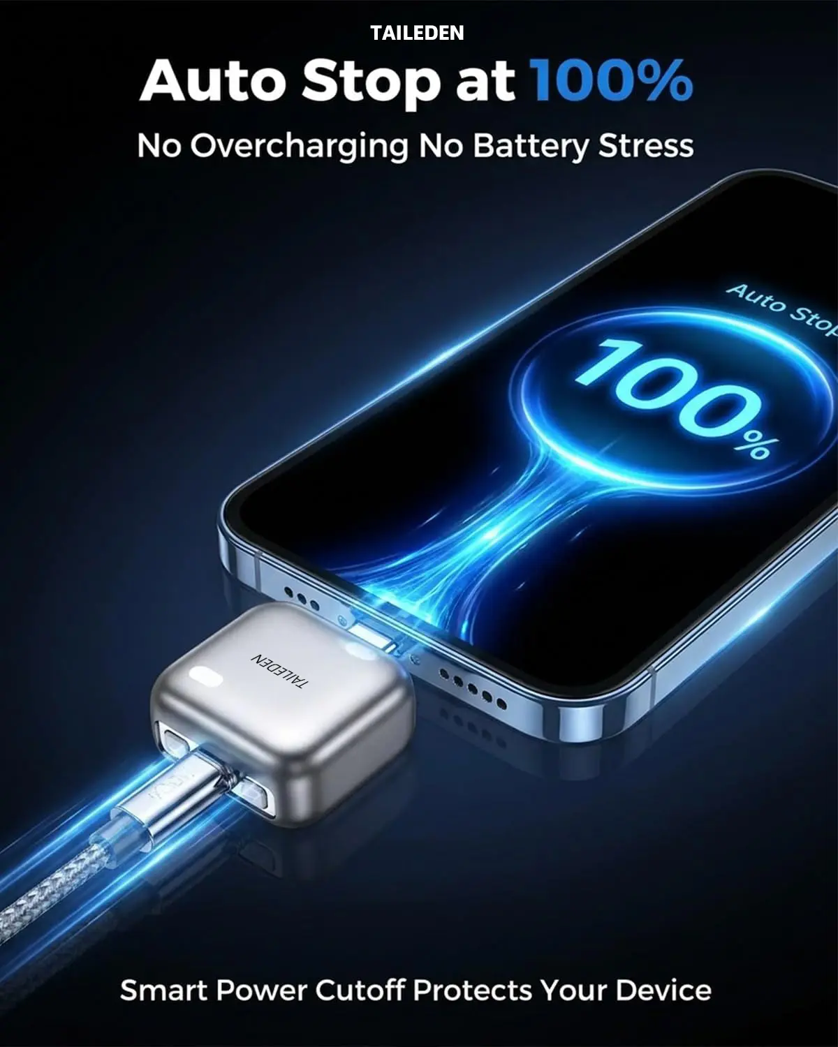 With the TAILENDEN Smart Charging Adapter, you can sleep soundly. It automatically deploys soft silicone to physically separate your phone once it reaches 100%.