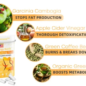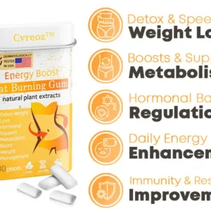Cvreoz™ Energy Boost Fat Burning Gum supports complete detoxification and boosts weight loss. It’s formulated with a potent blend of natural ingredients, including Apple Cider Vinegar (1000mg), Green Tea (250mg), Garcinia Cambogia (250mg), Raspberry Ketone (250mg), and Green Coffee Bean, delivering a comprehensive range of benefits to help you achieve your weight goals.
