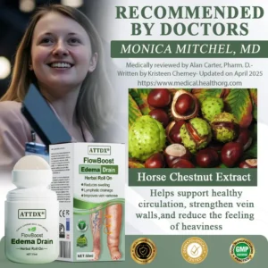 Combat swelling, tiredness, and poor circulation with ATTDX® FlowBoost Edema Drain Herbal Roll On, powered by Horse Chestnut Extract and other potent natural ingredients.