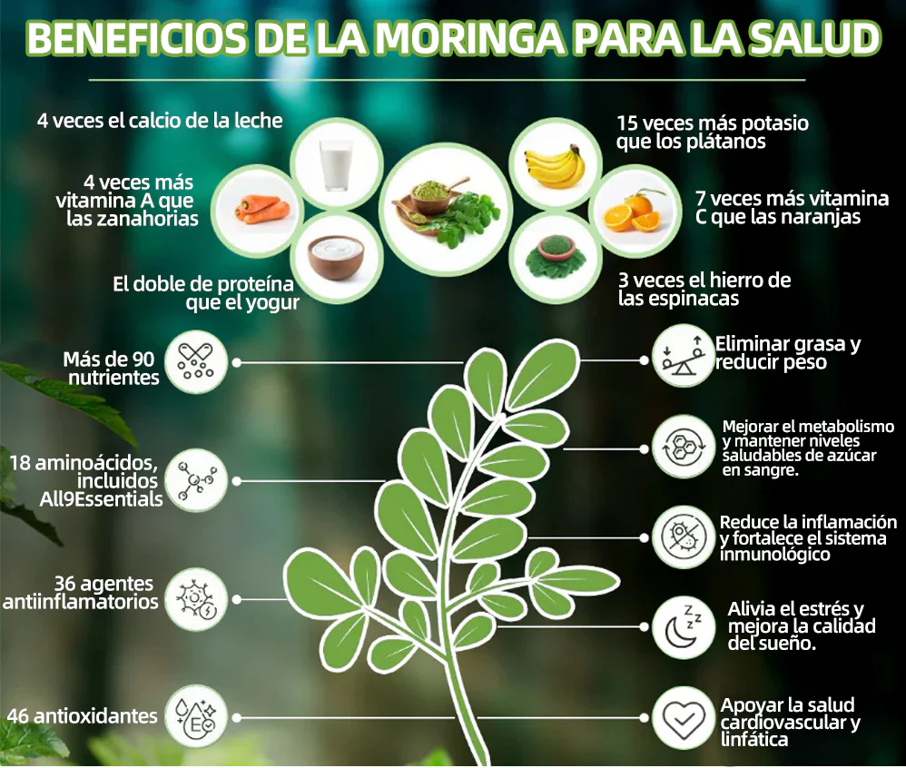 La moringa es una fuente natural de nutrientes que apoya la pérdida de peso y la salud integral. Contiene proteínas vegetales y todos los nueve aminoácidos esenciales, lo que la convierte en una fuente completa de proteína. Rica en vitaminas A, C y E, ayuda a mejorar la visión, fortalecer el sistema inmunológico y promover la producción de colágeno. También proporciona calcio, hierro y potasio para mantener la salud ósea y cardiovascular. Sus antioxidantes reducen la inflamación y su contenido de fibra favorece la digestión y regula los niveles de azúcar en sangre. Además, la moringa estimula naturalmente la producción de GLP-1, ayudando a controlar el hambre y apoyar una gestión saludable del peso.