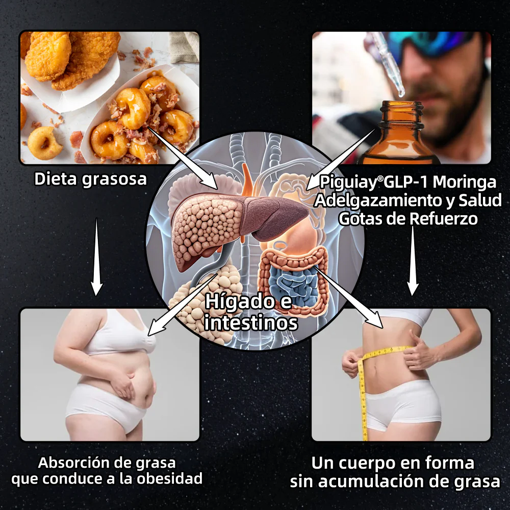 Piguiay® GLP-1 Gotas Saludables Adelgazantes de Moringa ayudan a controlar el azúcar en la sangre al estimular la secreción de insulina e inhibir la liberación de glucagón, lo cual estabiliza los niveles de glucosa. El GLP-1 también retrasa el vaciamiento gástrico y aumenta la sensación de saciedad, reduciendo la ingesta de alimentos y promoviendo la pérdida de peso. La reducción de peso mejora la sensibilidad a la insulina, disminuye el azúcar en la sangre y reduce el riesgo de complicaciones diabéticas, convirtiendo a Piguiay® GLP-1 Gotas en una herramienta efectiva para el manejo de la diabetes, especialmente para quienes buscan mejorar tanto su salud metabólica como su composición corporal.