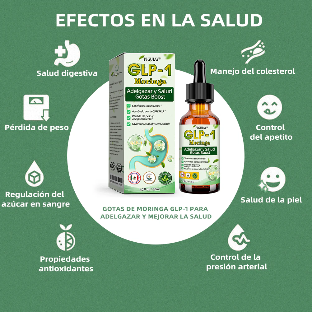 Piguiay® GLP-1 Gotas Saludables Adelgazantes de Moringa contienen extracto de moringa, un superalimento natural que ayuda a acelerar el metabolismo, promover la quema de grasa y regular los niveles de azúcar en la sangre. Además, la moringa apoya la salud de las articulaciones y los huesos, mientras incrementa la vitalidad general. Según investigaciones respaldadas por autoridades sanitarias internacionales y ahora validadas en México, la combinación de moringa y GLP-1 ofrece un soporte más completo para la salud integral del organismo.