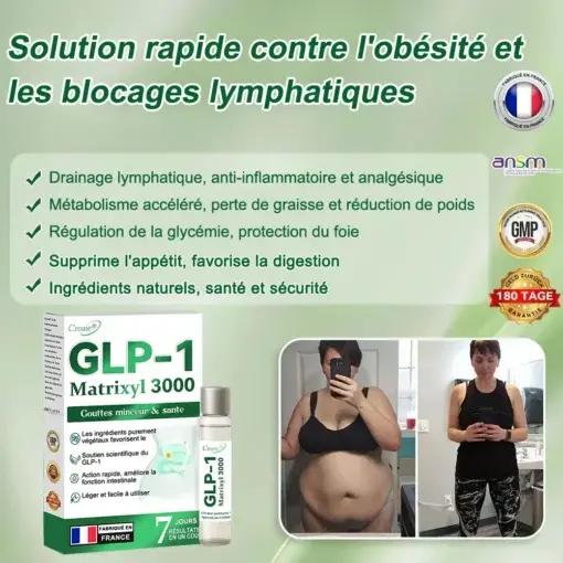 CROAIE® Gouttes Minceur & Santé GLP-1 & Matrixyl 3000 ont été développées par une équipe de plus de 30 experts internationaux en endocrinologie et diabétologie après plus de 3 ans de recherche. Elles combinent le tirzépatide avec de puissants ingrédients végétaux pour stimuler le métabolisme, accélérer la combustion des graisses et soutenir la santé digestive ainsi que lymphatique. Cette solution orale a été approuvée par l’ANSM (Agence nationale de sécurité du médicament et des produits de santé) pour sa sécurité et son efficacité, offrant une solution scientifiquement fondée pour la perte de poids et le bien-être global.