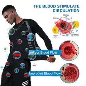 Tourmaline is a natural mineral with negative ions and far-infrared radiation and is widely used in the health sector. The negative ions emitted by tourmaline can boost metabolism and blood circulation, relieving fatigue and tension. The negative ions also have anti-inflammatory and antioxidant properties, helping to reduce muscle pain and promote tissue repair. The tight fit of the men’s shaping Sportswear provides compression and support to improve circulation and metabolism, as well as improving body posture and shaping.
