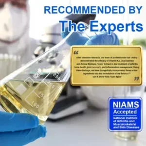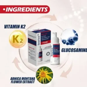 Seurico™ Joint & Bone Pain Foam Spray is expertly formulated to promote freedom of movement and relieve pain in the joints. This advanced solution combines Vitamin K2Glucosamine, and Arnica Montana Flower Extract in a potent liquid form for quick absorption. Upon application, Vitamin K2 and Glucosamine provide essential nutrients to bones and joints, while Arnica Montana delivers powerful anti-inflammatory support. This combination enables deep penetration to target inflammation and relieve discomfort in joints and connective tissues, making it effective for over 100 types of arthritis and conditions such as varicose veins.
