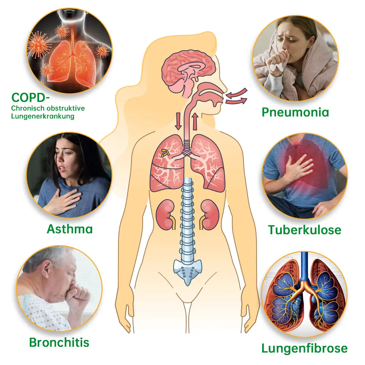 Laut Statistiken der U.S. Centers for Disease Control and Prevention (CDC leiden weltweit etwa 40 Millionen Menschen an verschiedenen Atemwegserkrankungen. Diese Erkrankungen werden hauptsächlich durch Faktoren wie Alterung, Rauchen, Alkoholmissbrauch, Luftverschmutzung und berufliche Gefahren verursacht. Im Laufe der Zeit führen diese Faktoren zu einem allmählichen Rückgang der Lungenfunktion und einer verringerten Fähigkeit, Infektionen abzuwehren. Toxine aus dem Rauchen und der Luftverschmutzung werden direkt von den Lungen aufgenommen, wodurch der Schleim dick und für den Körper schwer auszustoßen wird. Diese Ansammlung kann zu Blockaden führen, die eine Reihe von Atemwegserkrankungen auslösen, darunter chronisch obstruktive Lungenerkrankung (COPD), Asthma, Pneumonie, Tuberkulose, interstitielle Lungenerkrankung, Bronchiektasie und Lungenkrebs.
