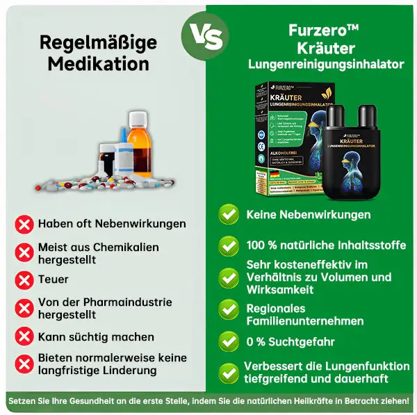 Furzero™ wurde von Lungenärzten und Dermatologen getestet und ist völlig hypoallergen, sodass es für alle Altersgruppen geeignet ist. Im Gegensatz zu Medikamenten, von denen Ihr Körper möglicherweise abhängig wird, um Symptome zu lindern, ist der Furzero™ Kräuter-Lungenreinigungsinhalator zu 100 % natürlich und kann viele verschreibungspflichtige und rezeptfreie Atemwegsmittel sowie Schleimlöser ersetzen. Im Laufe der Zeit hilft er, die Lungenfunktion allmählich zu verbessern und die Immunität des Atmungssystems durch natürliche Therapie zu stärken.