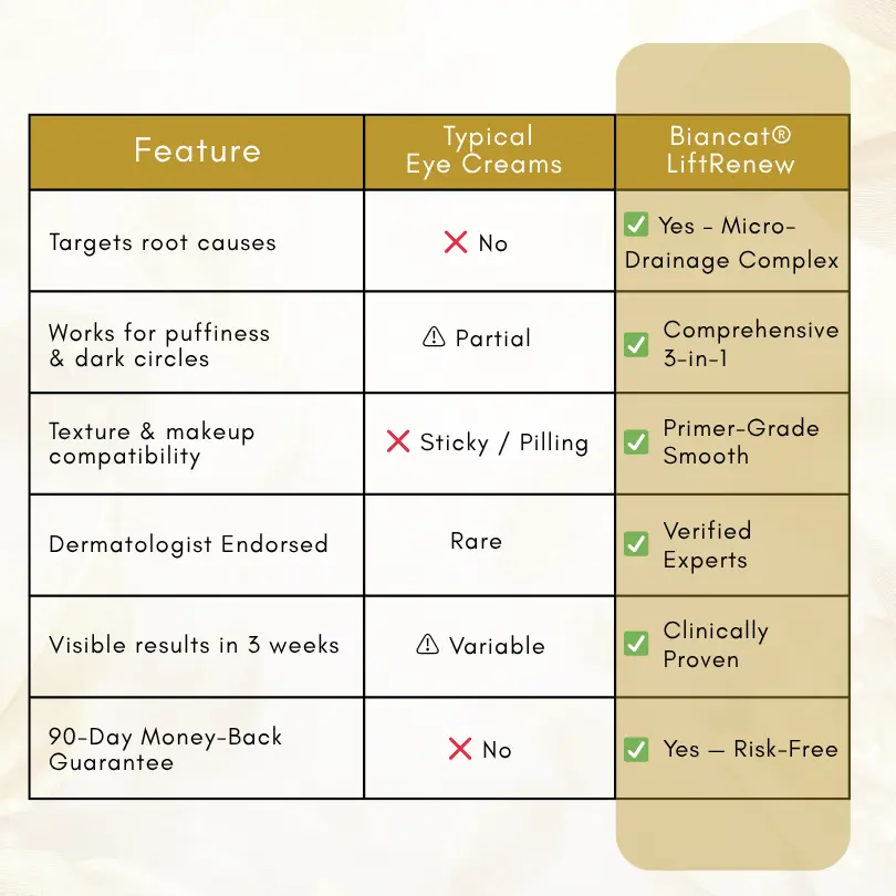 Unlike ordinary eye creams that only hydrate the surface, Biancat®LiftRenew’s Dual-Action Micro-Drainage Complex targets the root causes of tired-looking eyes — fluid buildup and thinning skin. It visibly drains puffiness, brightens dark circles, and firms delicate under-eye tissue for lasting, healthy radiance.