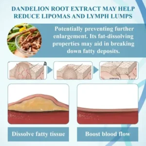 Lovilds™ LumpsClear Lymph Support Roll-On includes dandelion root extract, valued for its powerful flavonoids and polysaccharides that provide anti-inflammatory benefits. This extract helps to reduce swelling, enhances lymphatic circulation, and works to prevent inflammation that contributes to lipoma and lymph lump formation. Additionally, it supports the breakdown of fatty deposits, potentially decreasing lipoma size. With consistent topical application, this roll-on helps maintain smooth skin and reduce lump visibility over time, contributing to healthier tissue appearance.