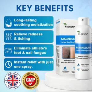 KUBOZN® Magnesium Repair Spray penetrates deep into the skin, gently cleansing from the inside out and quickly relieving itchiness and inflammation caused by psoriasis. This steroid-free, non-irritating formula is safe for sensitive and compromised skin. KUBOZN® helps regulate excessive skin cell proliferation, soothes redness, flaking, and stinging, and supports the restoration of the skin’s natural barrier—bringing your skin back to balance and health.