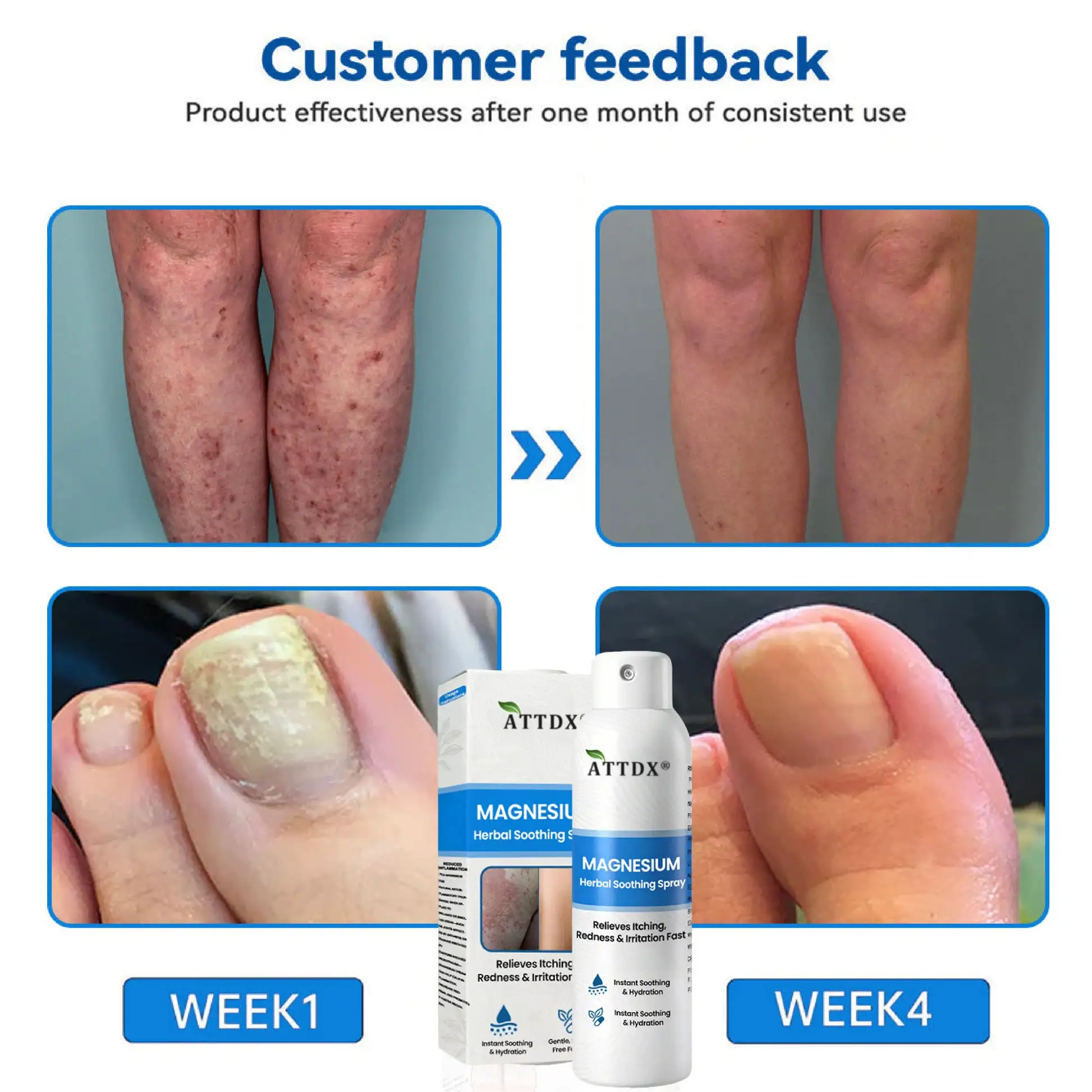 ATTDX® Magnesium Herbal Soothing Spray is a gentle formula designed for daily use, highly praised for its deep soothing and effective healing properties. It delivers intense hydration to relieve dryness and tightness caused by conditions like psoriasis and eczema. Enriched with natural antioxidants and anti-inflammatory ingredients, it helps regulate inflammation, promotes healthy skin cell renewal, and accelerates the natural repair process of damaged skin. Safe and suitable for all sensitive and problem-prone areas of the body, including intimate regions.
