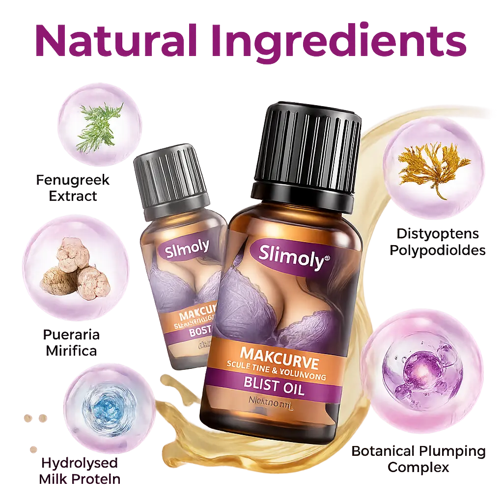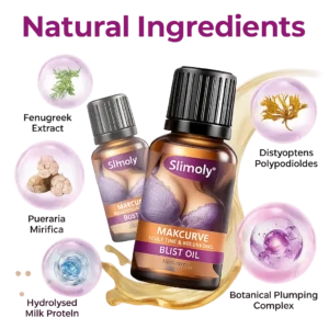 Slimoly® MaxCurve Sculpting & Volumizing Bust Oil is infused with plant-derived active extracts. It targets estrogen receptors, improves skin elasticity and tension, and supports balanced localized fat distribution.