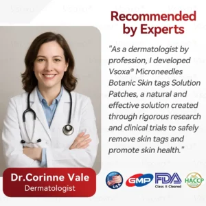 “As a dedicated dermatologist, my passion has always been to develop safe, natural, and effective solutions for skin concerns. Through rigorous research, extensive testing with my expert lab team, and clinical trials involving over 2,000 participants, I uncovered that microneedling combined with a potent natural ingredient offers a revolutionary approach to treating skin tags. This breakthrough inspired me to create the 𝐕𝐬𝐨𝐱𝐚® 𝐌𝐢𝐜𝐫𝐨𝐧𝐞𝐞𝐝𝐥𝐞𝐬 𝐁𝐨𝐭𝐚𝐧𝐢𝐜 𝐒𝐤𝐢𝐧 𝐭𝐚𝐠𝐬 𝐒𝐨𝐥𝐮𝐭𝐢𝐨𝐧 𝐏𝐚𝐭𝐜𝐡𝐞𝐬—a precisely formulated, natural solution designed to effectively and gently eliminate skin tags while promoting healthy skin.”- Dr.Corinne Vale