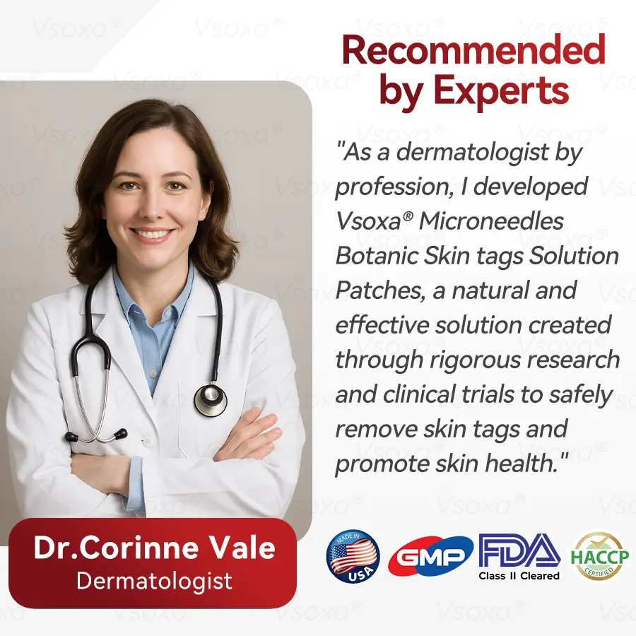 This product has undergone rigorous clinical validation, received FDA approval, and has been recommended by several leading dermatologists. Our R&D team specializes in skin research and is dedicated to advancing the field of treatment and prevention, with decades of clinical and educational experience. Through extensive clinical trials and scientific validation, Vsoxa® Microneedles Botanic Skin Tags Solution Patches have been shown to be effective in improving a wide range of skin conditions including moles, warts, hyperpigmentation, acne, and age spots, as well as dramatically improving the health and appearance of the skin after long-term use. Our clinical certification not only proves the safety of the product, but also confirms its excellent results in skin repair and anti-aging.