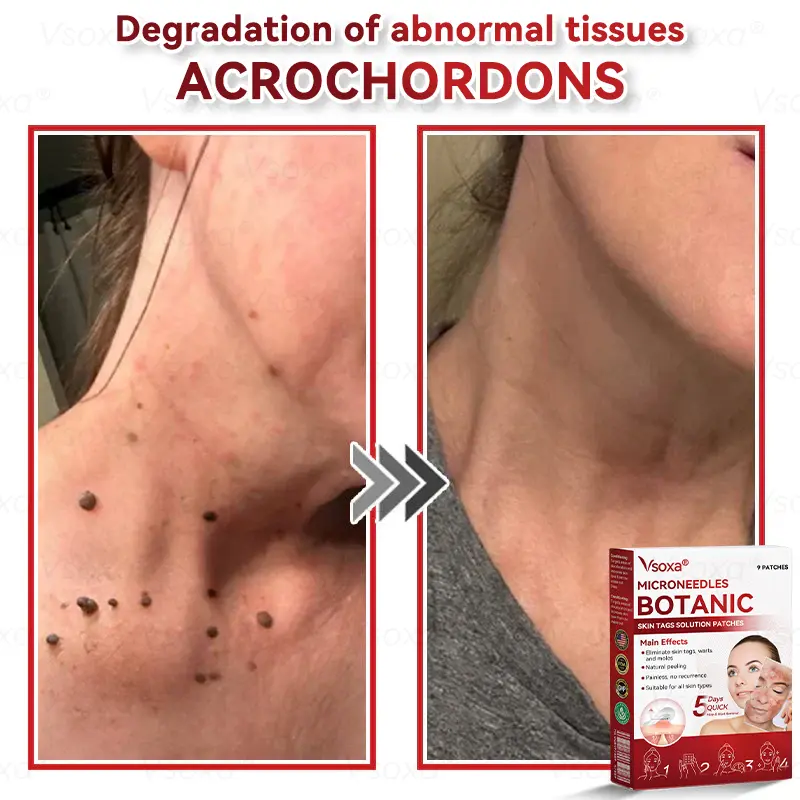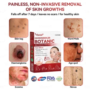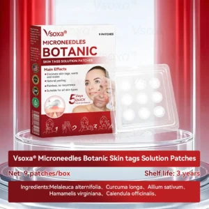 The 𝐕𝐬𝐨𝐱𝐚® 𝐌𝐢𝐜𝐫𝐨𝐧𝐞𝐞𝐝𝐥𝐞𝐬 𝐁𝐨𝐭𝐚𝐧𝐢𝐜 𝐒𝐤𝐢𝐧 𝐭𝐚𝐠𝐬 𝐒𝐨𝐥𝐮𝐭𝐢𝐨𝐧 𝐏𝐚𝐭𝐜𝐡𝐞𝐬 is an organic micro-needle patch that delivers Plant-based ingredients deep into the skin to remove skin tags, moles, and warts. Just one application can cause unwanted skin tags to fall off within five days, making it an effective treatment. It is highly recommended by pharmacists and dermatologists worldwide for its safety, reliability, and non-prescription convenience.