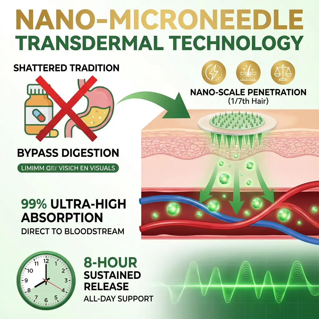 ● High Absorption Rate: Features Nano-Microneedle Transdermal technology that bypasses stomach acid, achieving an absorption rate of up to 99%.
