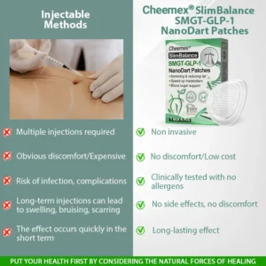 According to The National Institute of Diabetes and Digestive and Kidney Diseases (NIDDK), the Cheemex® SlimBalance SMGT-GLP-1 NanoDart Patches represent a novel advancement in metabolic regulation and weight management. Utilizing GLP-1 peptides, these patches facilitate appetite modulation and enhance metabolic efficiency. Their sophisticated nano-delivery system ensures precise transdermal administration, offering a cutting-edge alternative to conventional therapeutic methods.