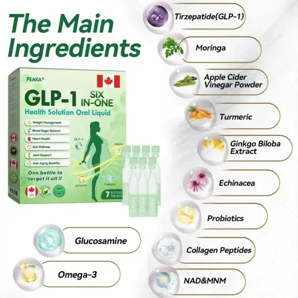 Peaka® GLP‑1 SIX‑IN‑ONE Health Solution Oral Liquid is a clinically endorsed, GMP‑certified, Health Canada (HC)-approved daily oral supplement combining GLP‑1 (Tirzepatide), NAD+, and botanical elements like moringa, turmeric, and apple cider vinegar. Created by international specialists in endocrinology and diabetology, it’s a safe, science-based solution for weight loss, metabolic support, blood sugar control, and overall wellness.