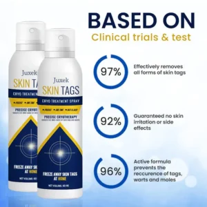 Extensive trials and testing confirm that cryotherapy is one of the most effective methods for removing benign skin growths. In clinical studies, over 87% of skin tags and 82% of warts treated with cryo methods were successfully removed after a single application. Juxek® adapts this professional-grade approach into a safe, convenient spray for home use.