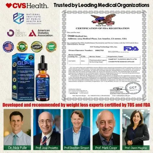 Croaie® GLP-1 Slimming & Health Ultra Concentrated Essence Liquid drops were developed by a team of leading endocrinologists and obesity specialists, These include expert testimonials accredited by the American Diabetes Association (ADA) and the Obesity Medicine Association (OMA). Manufactured in an FDA-registered, cGMP-certified facility that meets U.S. standards for safety and purity in drug manufacturing, Croaie® has been endorsed by leading medical experts and supported by authorities such as the American Diabetes Association (ADA), CVS Pharmacy and the National Institutes of Health (NIH). NIH, among others.