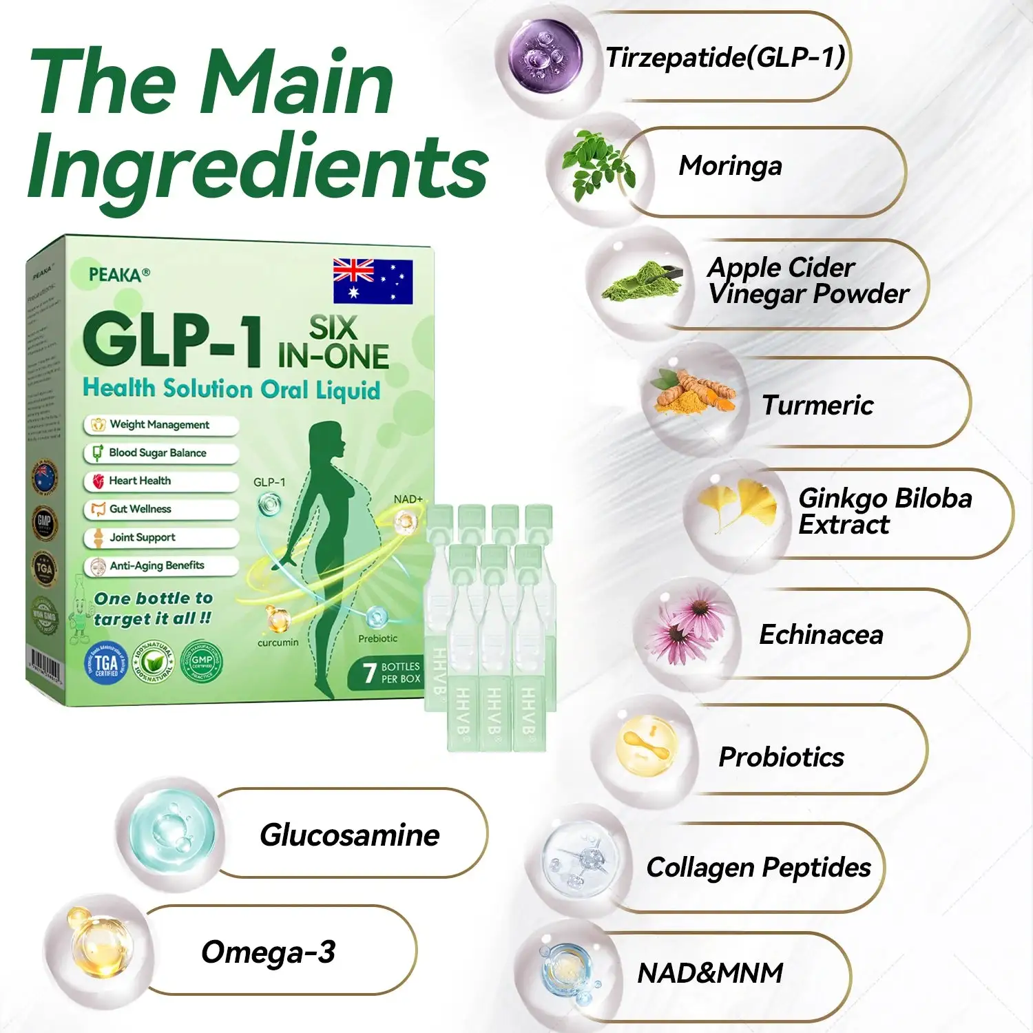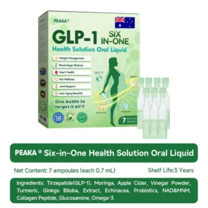 PEAKAยฎ GLP-1 SIX-IN-ONE Health Solution Oral Liquidย was developed by a team of over 30 leading experts in endocrinology and metabolic health after more than three years of research. Formulated with Tirzepatide and potent plant-based ingredients. it works to naturally boost metabolism. accelerate fat burning. and support digestive and lymphatic health. This oral solution meets stringent Australian safety and efficacy standards and is backed by international research. offering a reliable and science-based approach to healthy weight loss and overall wellbeing.