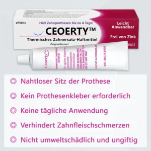 Der Ceoerty™ Thermoplastische Prothesenkleber nutzt fortschrittliche Technologie, um eine flexible, elastische Verbindung zu schaffen, die sich Ihrem Zahnfleisch und Ihrer Prothese anpasst. Diese haltbare Schicht fixiert die Prothese und ermöglicht natürliche Bewegungen, wodurch das Verrutschen minimiert wird und mehr Vertrauen und Komfort entsteht. Die feuchtigkeitsspendenden Eigenschaften schützen und hydratisieren Ihr Zahnfleisch und fördern eine gesündere Mundumgebung, indem sie Reibung und Irritationen reduzieren.