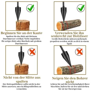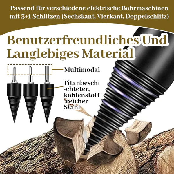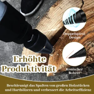 - Konischer Bohrer: Tiefe Gewinde für schnelleres Spalten, ideal um große Blöcke in Anzündholz zu verwandeln.
