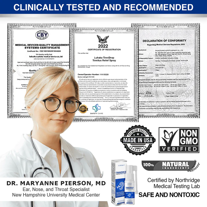 Dr. Maryanne Pierson, M.D., an otolaryngologist at New Hampshire University Medical Center in Massachusetts, and numerous other ENTs have regarded TinniDrop Tinnitus Relief Spray as a breakthrough solution for individuals whose tinnitus persists as a chronic hindrance. While some people may experience a reduction or relief of symptoms over time, others find that tinnitus continues to significantly impact their daily lives. TinniDrop is considered a highly effective over-the-counter remedy, providing relief from tinnitus and its associated symptoms.