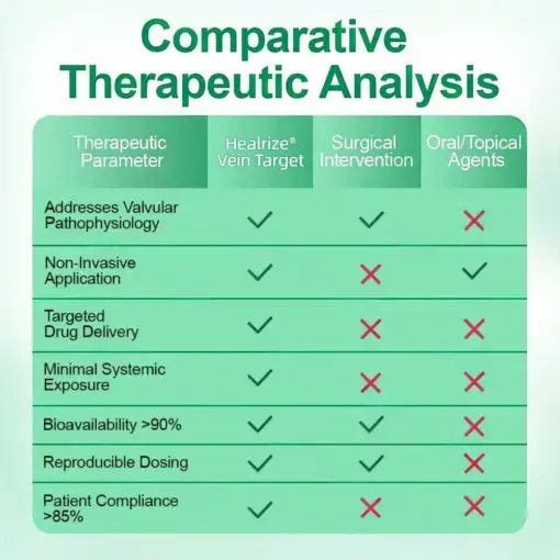 Healrize® VeinTarget represents the first commercially available transdermal phytotherapy system specifically designed to address venous valvular insufficiency through localized botanical intervention. Unlike systemic treatments that dilute active compounds throughout the circulatory system or topical applications that cannot penetrate the dermal barrier. our microneedle delivery system ensures concentrated therapeutic compounds reach the target tissue with minimal systemic exposure.