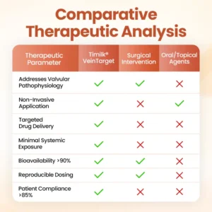 Timilk® VeinTarget represents the first commercially available transdermal phytotherapy system specifically designed to address venous valvular insufficiency through localized botanical intervention. Unlike systemic treatments that dilute active compounds throughout the circulatory system or topical applications that cannot penetrate the dermal barrier, our microneedle delivery system ensures concentrated therapeutic compounds reach the target tissue with minimal systemic exposure.