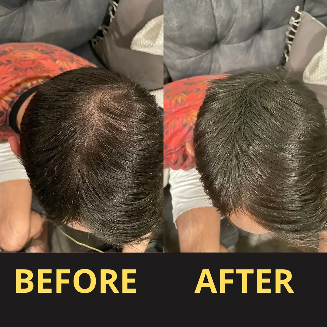 Drag the slider to see how Yagoo visually covers thinning areas with a waterproof hair concealer,creating a natural, sweat-resistant fuller hair look I after about 30 minutes.